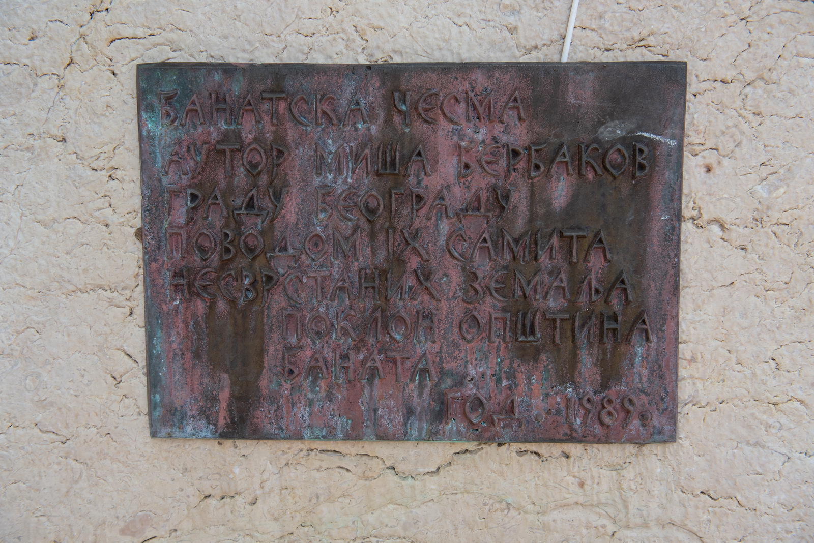 Ова чесма, по решењу зрењанинског архитекте Мише Бербакова уручена је у оквиру акције Сталне конференције градова и општина Југославије и Завода за заштиту споменика културе града Београда у сврху уређења града Београда приликом организације IX самита Покрета несврстаних, одржаног од 4. до 7. септембра 1989. године, и представља поклон банатских општина. Ова југословенска поклон-галерија имала је за циљ да представи солидарност југословенских општина и региона и да буде потврда пријатељства и заједништва. Дарови који су украсили главни град су, како бележи тадашња штампа, сваки на свој начин представљали средину одакле долазе, у нади да ће главни град и убудуће представљати „Југославију у малом”. Како тадашња штампа истиче тиме је „свету пружен доказ да унутрашње свађе и неслагања, на жалост најчешће својствена врховним руководствима, нису део свакодневице радног човека и грађанина, као и то да укупна снага земље, залог њеног јединства и оопстанка јесте узајамност радних људи и грађана тако несебично показана овом приликом.”