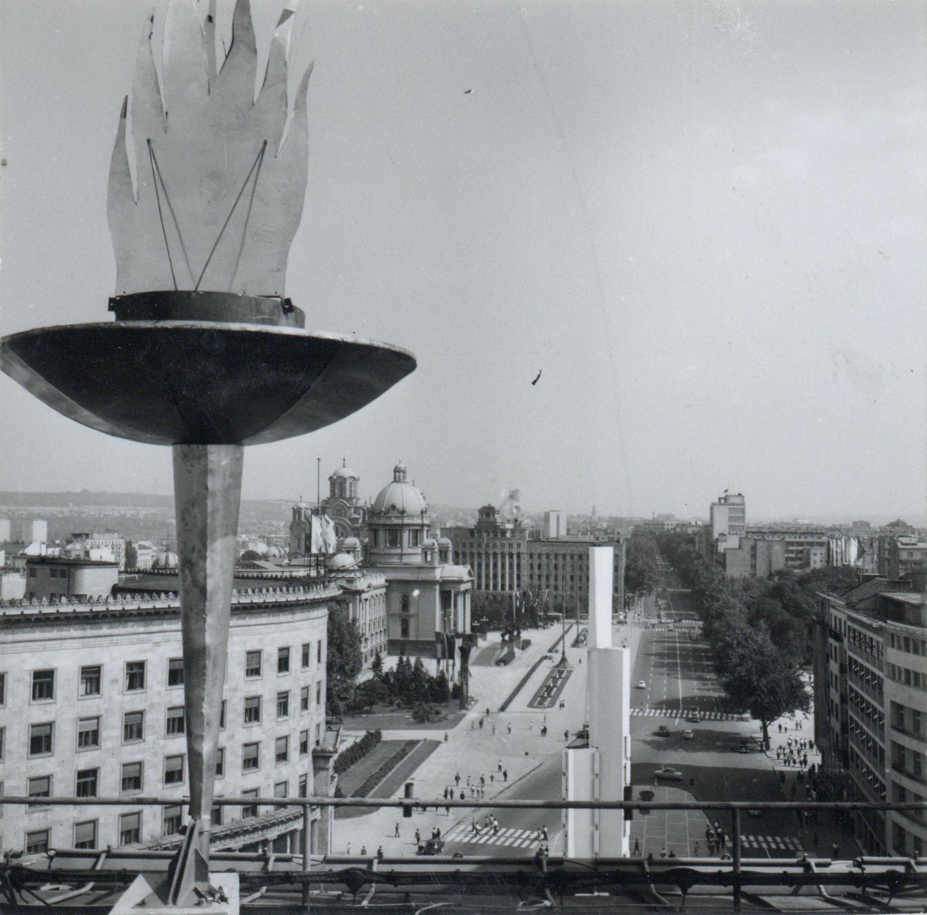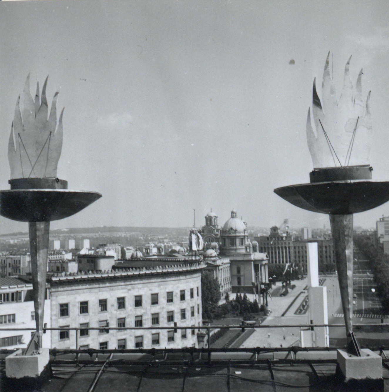 - Na krovu Centra za štampu Beogradske konferencije smeštenom u Domu sindikata Jugoslavije bilo je postavljeno 6 baklji koje su titrale crvenom bojom. Zajedno sa novopostavljenim neonskim reklamama, sistemom osvetljenja, fontanama i obeliskom-tornjom sa neonima, činile su deo uređenja grada Beograda za Prvu konferenciju Pokreta nesvrstanih.