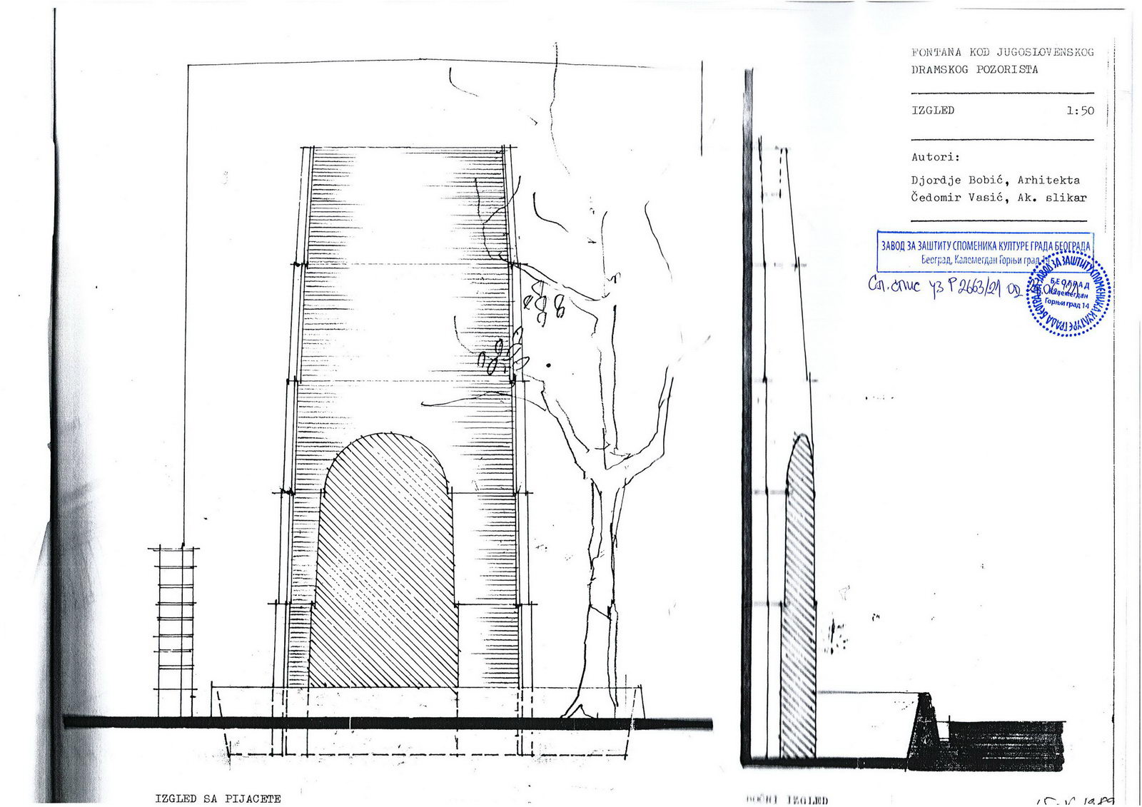 Фонтана под називом Слап на северној фасади Југословенског драмског позоришта заједнички је рад архитекте Ђорђа Бобића и сликара Чедомира Васића, по чијем је идејном решењу реализована. Настала је у оквиру акције Сталне конференције градова и општина Југославије и Завода за заштиту споменика културе града Београда у сврху уређења града Београда приликом организације IX самита Покрета несврстаних, одржаног од 4. до 7. септембра 1989. године. Ова југословенска поклон-галерија имала је за циљ да представи солидарност југословенских општина и региона и да буде потврда пријатељства и заједништва. Дарови који су украсили главни град су, како бележи тадашња штампа, сваки на свој начин представљали средину одакле долазе, у нади да ће главни град и убудуће представљати „Југославију у малом”. Како тадашња штампа истиче тиме је „свету пружен доказ да унутрашње свађе и неслагања, на жалост најчешће својствена врховним руководствима, нису део свакодневице радног човека и грађанина, као и то да укупна снага земље, залог њеног јединства и оопстанка јесте узајамност радних људи и грађана тако несебично показана овом приликом.”