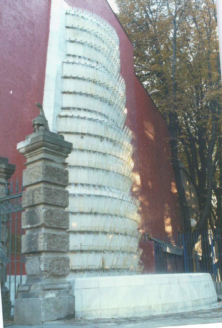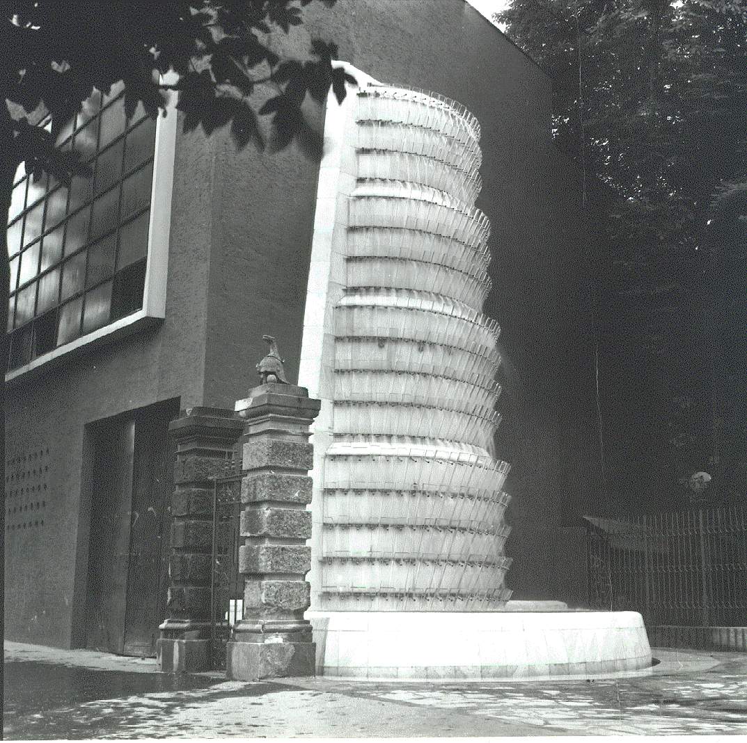 Ова преливна фонтана је поклон града Новог Сада и општина Ада, Апатин, Бач, Бачка Паланка, Бачки Петровац, Бечеј, Жабаљ, Кањижа, Кула, Мали Иђош, Оџаци, Сента, Сомбор, Србобран, Суботица, Темерин, Титов Врбас, Тител, Бачка Топола, Беочин, Инђија, Ириг, Пећинци, Рума, Сремска Митровица, Стара Пазова и Шид, а 2021. године је проналазимо у релативно добром и функционалном стању, на фасади ЈДП-а који је у међувремену променио изглед. Фонтана је 2013. године санирана, замењени су неисправни електромашински и хидраулички делови, осветљење, и реализовани су архитектонски и грађевински радови на замени клиритних плоча, заједно са уређењем базена фонтане и припадајућег платоа. Поред сваког поклона у оквиру ове градске галерије на отвореном налазила се бронзана плоча, рад Коље Милуновића, на којој су били исписани подаци о делу, аутору, дародавцу и IX конференцији Покрета несврстаних. Намера је била да овај бронзани детаљ остане трајно обележје лепог повода за поклон и читаве акције коју је покренула Стална конференција градова и општина Југославије. Бронзане плоче, као и сви радови, свечано су откривени 25. августа 1989. године. Та несвакидашња предаја поклона била је пропраћена музичким и драмским програмом, а завршена је здравицом уз севдалинке у Скадарлији. Данас, у већини случајева бронзаних плоча уз радове нема.