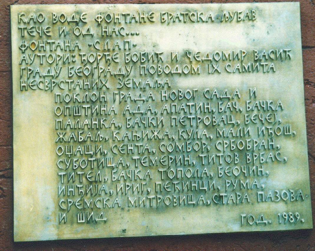 У тренутку формирања ове мапе, 2021. године, фонтана је и даље на истом месту, а њена спомен-плоча је и даље ту, али померена са друге, десне стране фонтане и са измењеним прилазом и фасадом (погледај галерију слика). У споменичком контексту, ову фонтану мапирамо и (пре)познајемо као израз југословенске солидарности и акције украшавања града Београда у име дочека делегација несврстаних у једном посве напетом и несигурном тренутку 1989. године. ...