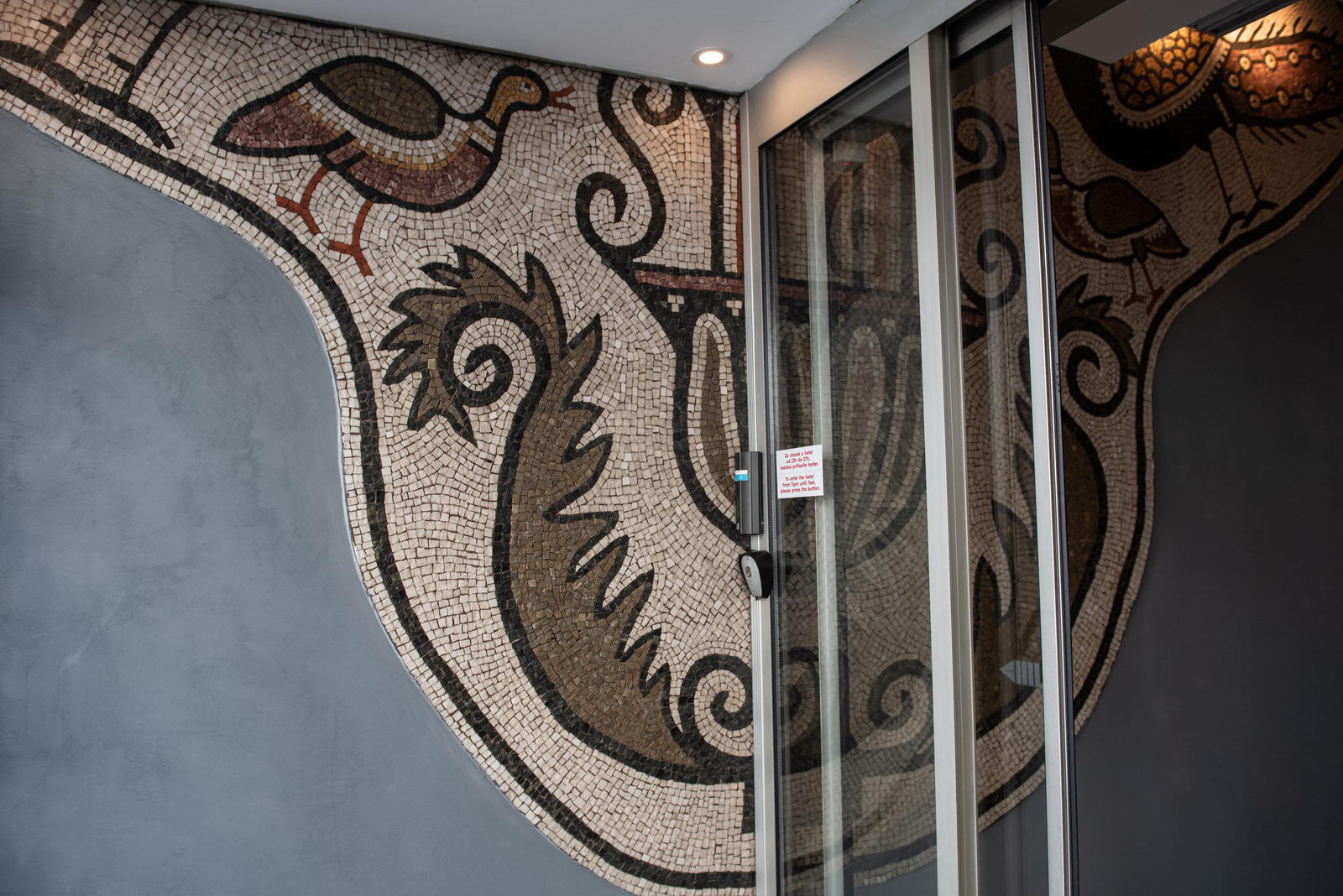 Ovaj mozaik je delo umetnika Momčila Petrovskog koje je u okviru akcije Stalne konferencije gradova i opština Jugoslavije i Zavoda za zaštitu spomenika kulture grada Beograda ostvareno na zidu kod apoteke u Knez Mihailovoj ulici u svrhu uređenja grada Beograda prilikom organizacije IX samita Pokreta nesvrstanih, održanog od 4. do 7. septembra 1989. godine. Reč je o poklonu opština Makedonije, a mozaik predstavlja kopiju mozaika sa arheoloških nalazišta u Stobiju. Ova jugoslovenska poklon-galerija imala je za cilj da predstavi solidarnost jugoslovenskih opština i regiona i da bude potvrda prijateljstva i zajedništva. Darovi koji su ukrasili glavni grad su, kako beleži tadašnja štampa, svaki na svoj način predstavljali sredinu odakle dolaze, u nadi da će glavni grad i ubuduće predstavljati „Jugoslaviju u malom”. Kako tadašnja štampa ističe time je „svetu pružen dokaz da unutrašnje svađe i neslaganja, na žalost najčešće svojstvena vrhovnim rukovodstvima, nisu deo svakodnevice radnog čoveka i građanina, kao i to da ukupna snaga zemlje, zalog njenog jedinstva i oopstanka jeste uzajamnost radnih ljudi i građana tako nesebično pokazana ovom prilikom.”