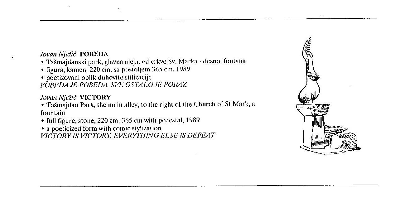 U prilogu dostavljamo i isečak iz knjige Beogradska skulptura u slobodnom prostoru: Parkovi, ljudi, događaji Darka Šarenca u izdanju NIP “Eksportpres” Beograd (1990):