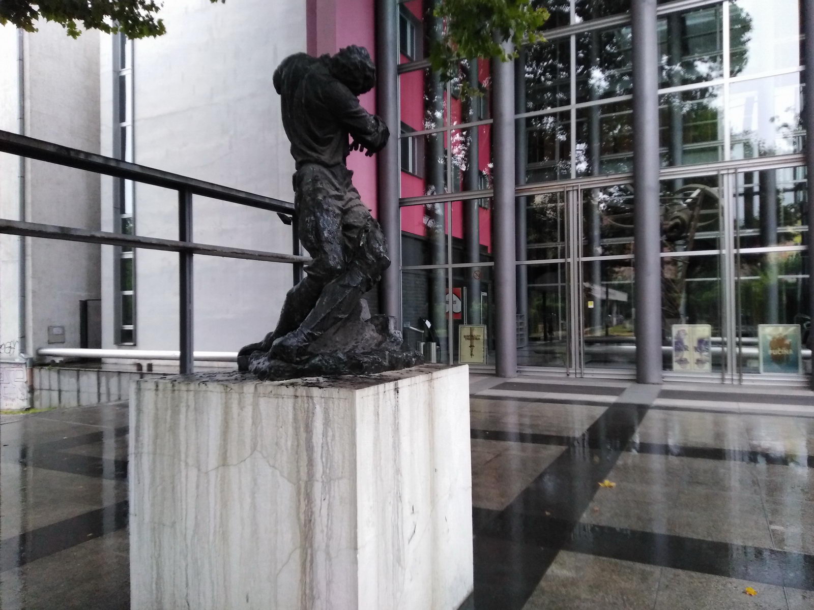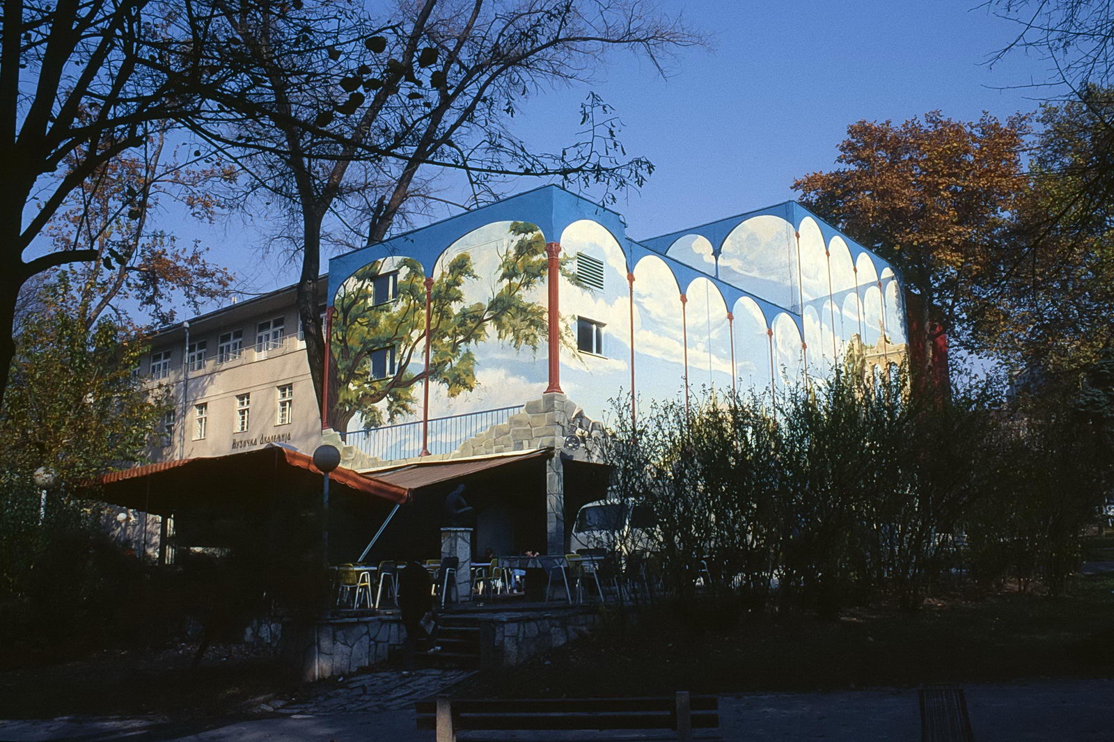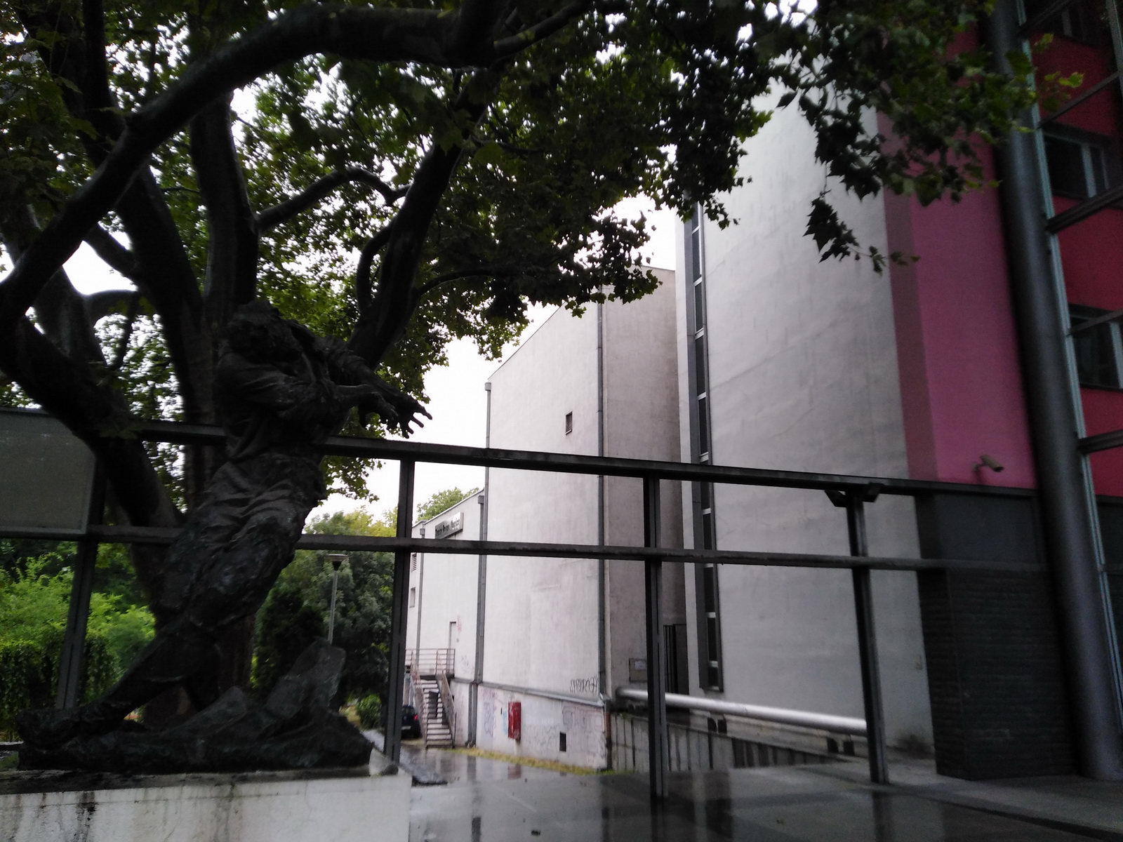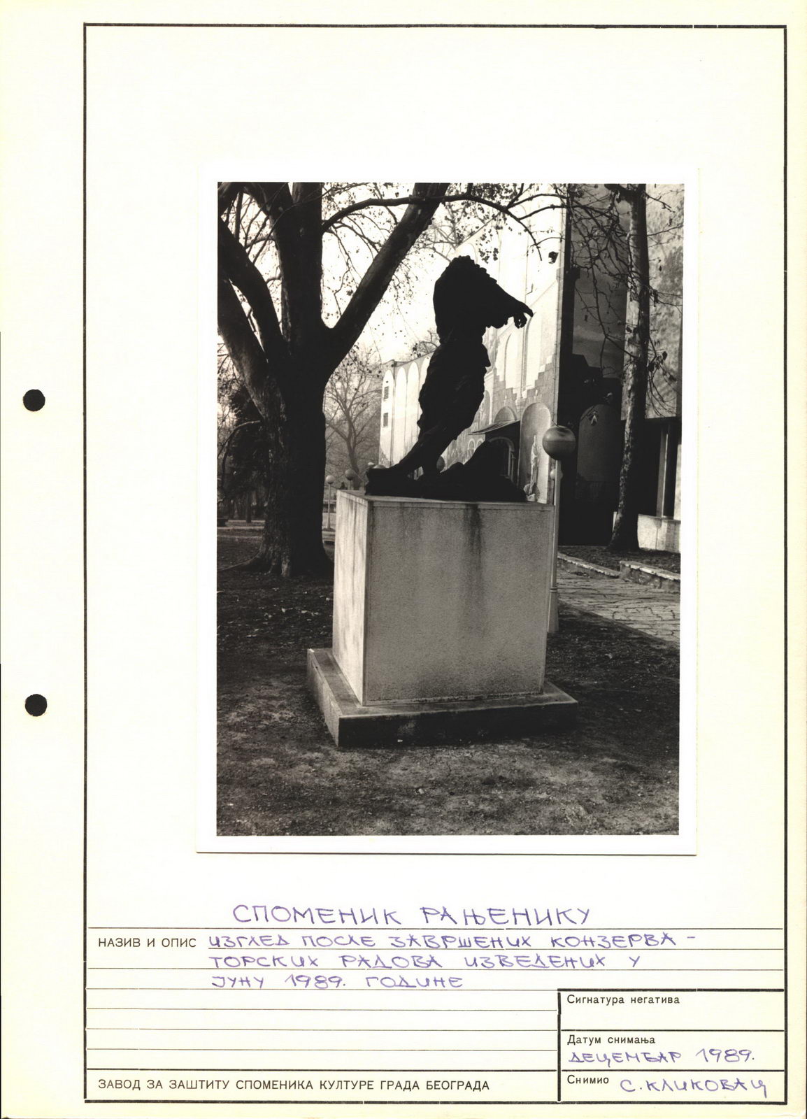 Skulptura koja se i danas nalazi ispred Jugoslovenskog dramskog pozorišta pod nazivom Ranjenik ili Streljanje rodoljuba delo je Vanje Radauša iz 1948. godine. U okviru akcije Stalne konferencije gradova i opština Jugoslavije i Zavoda za zaštitu spomenika kulture grada Beograda u svrhu uređenja grada Beograda prilikom organizacije IX samita Pokreta nesvrstanih, održanog od 4. do 7. septembra 1989. godine na ovoj skulpturi su izvršeni konzervatorski radovi. Tehnička dokumentacija o tim radovima dostupna nam je iz Zavoda za zaštitu spomenika kulture grada Beograda. Iz iste dokumentacije koju možete videti ovde, vidljiv je i izgled murala koji je izradio Slobodan Jevtić Pulika kao poklon međuopštinskih regionalnih zajednica Srbije i Kosova povodom organizacije IX konferencije Pokreta nesvrstanih. Ova jugoslovenska poklon-galerija imala je za cilj da predstavi solidarnost jugoslovenskih opština i regiona i da bude potvrda prijateljstva i zajedništva. Darovi koji su ukrasili glavni grad su, kako beleži tadašnja štampa, svaki na svoj način predstavljali sredinu odakle dolaze, u nadi da će glavni grad i ubuduće predstavljati „Jugoslaviju u malom”. Kako tadašnja štampa ističe time je „svetu pružen dokaz da unutrašnje svađe i neslaganja, na žalost najčešće svojstvena vrhovnim rukovodstvima, nisu deo svakodnevice radnog čoveka i građanina, kao i to da ukupna snaga zemlje, zalog njenog jedinstva i oopstanka jeste uzajamnost radnih ljudi i građana tako nesebično pokazana ovom prilikom.”