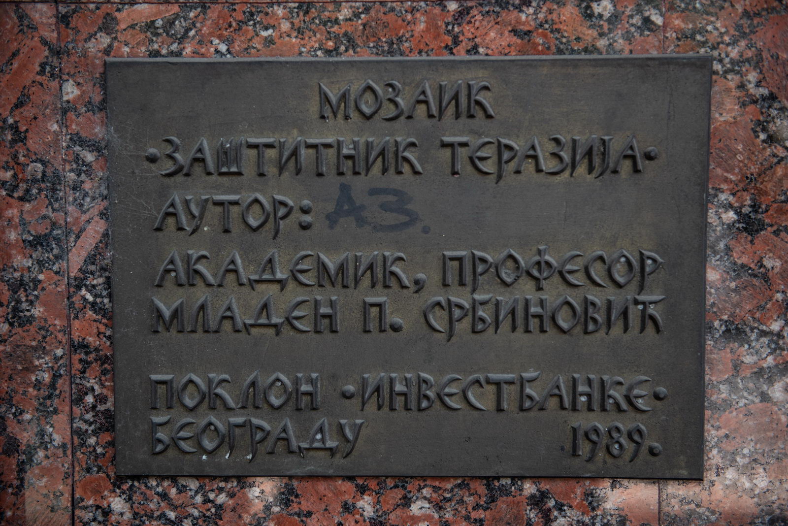 Мозаик је свечано отворен 2. септембра 1989. године, и једно је од ретких дела у оквиру ове југословенске покон-галерије које и 2021. године има плочу са натписом који објашњава да је реч о раду Младена Србиновића, под називом Заштитник Теразија, и који је поклон Инвестбанке Београду. Једина информација која недостаје је она поводом које настаје ова мапа несврстаности – она која повезује поклон са акцијом уређења града приликом организације IX конференције Покрета несврстаних. Композиција мозаика састављена је из неколико знамења која оличавају материјалну основу, духовне вредности и националну традицију.