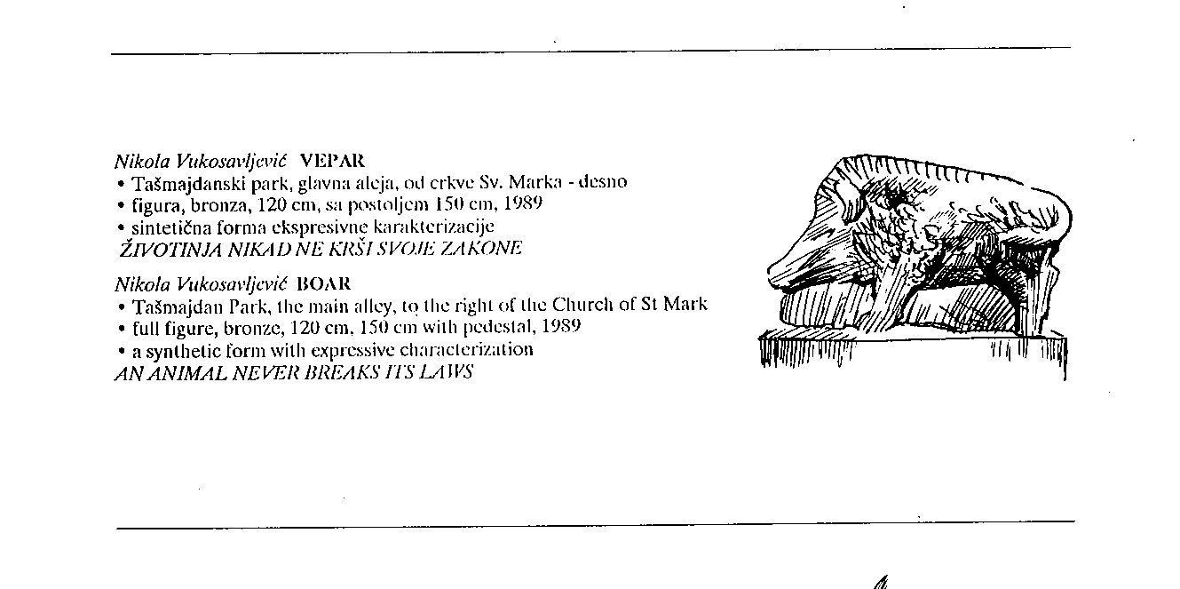 U prilogu dostavljamo i isečak iz knjige Beogradska skulptura u slobodnom prostoru: Parkovi, ljudi, događaji Darka Šarenca u izdanju NIP “Eksportpres” Beograd (1990):